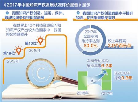 《2017年中国知识产权发展状况评价报告》今日在北京发布。《报告》显示,2017年,我国知识产权创造、运用、保护、管理和服务等各项工作取得明显进展,知识产权综合发展指数为218.3(以2010年为100),比上年增长9.0%,保持较高增速。在世界上40个科技资源投入和知识产权产出较大的国家中,我国知识产权发展状况排名从2012……