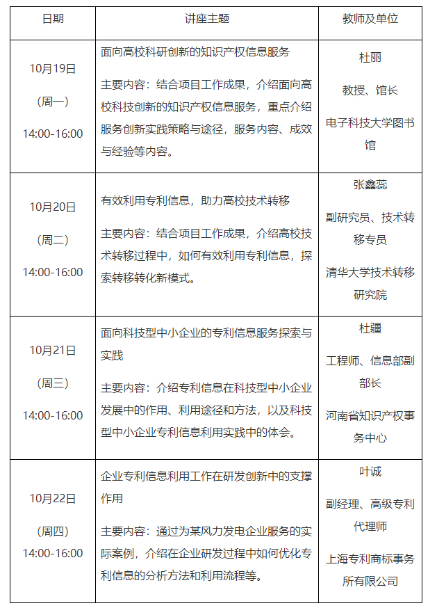 摘要:国家知识产权局专利文献馆将于10月19日-10月22日举办“高校、企业专利信息利用实务”专题公益讲座。
